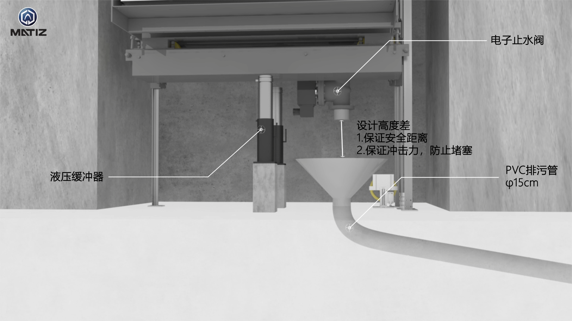①轿厢内新增地漏安装安装,地漏安装安装与轿底废污水处理管开设合合适量的储水罐空間,货梯在启动时可合合适量储备废污水;