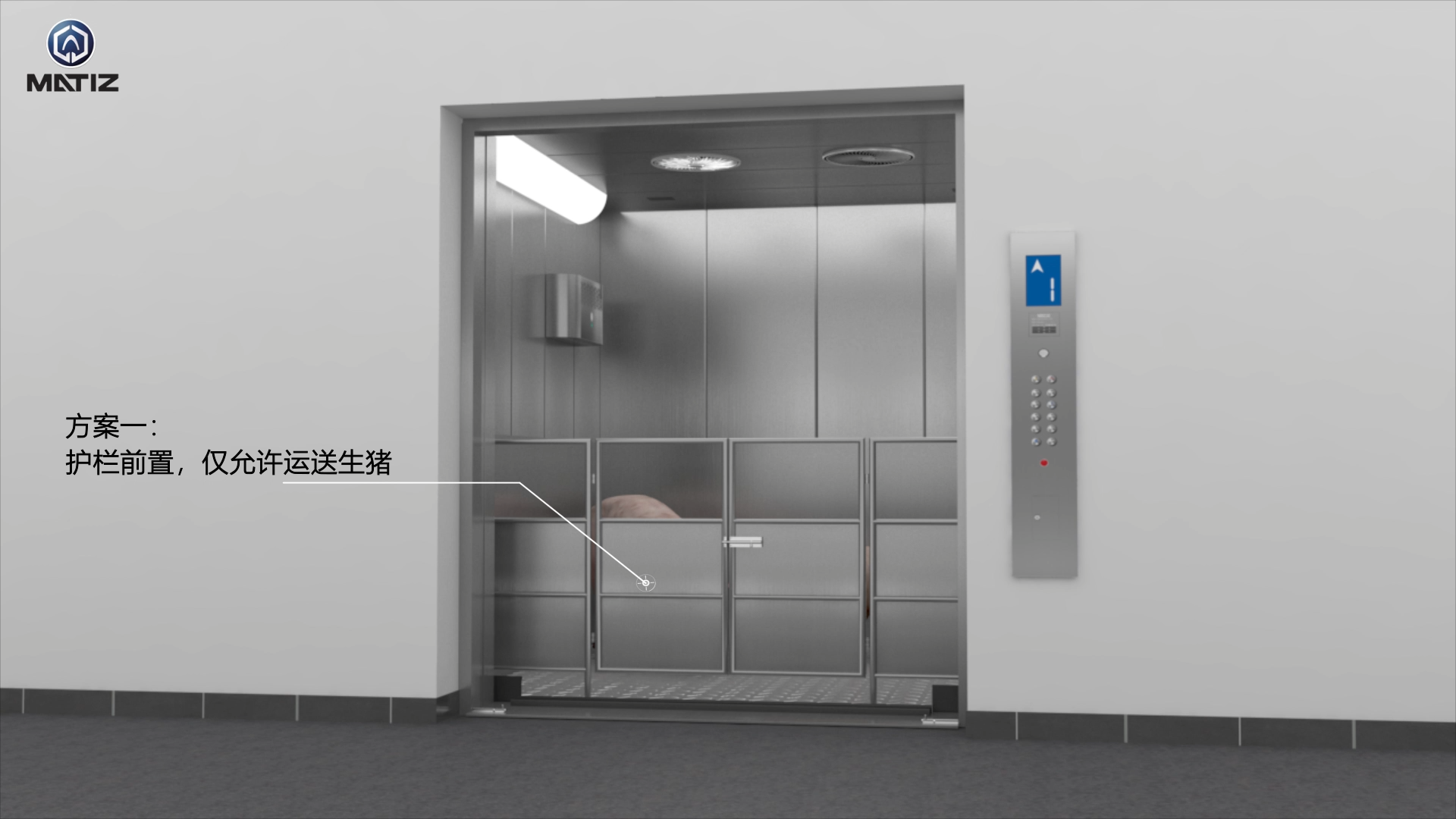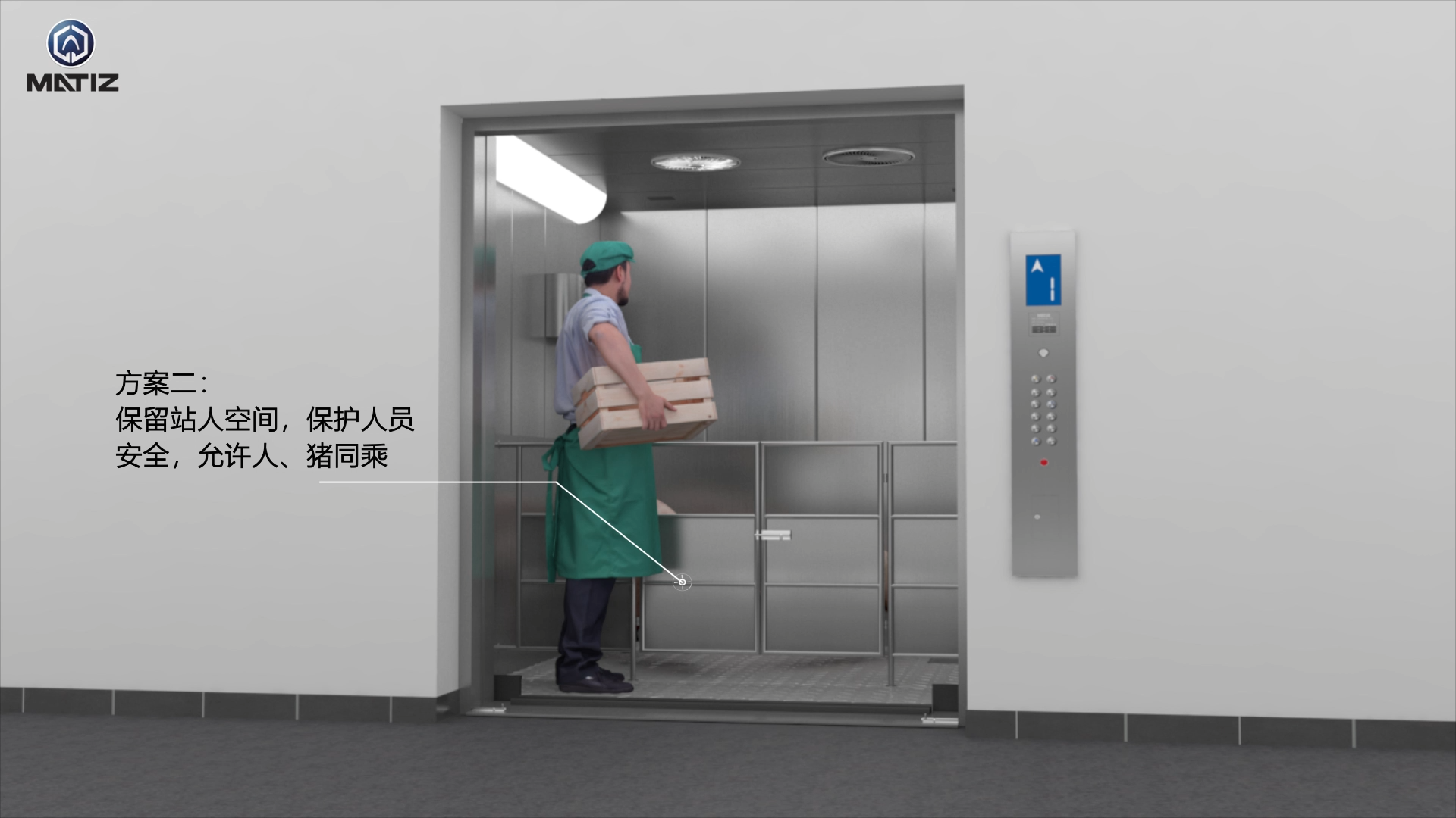 (b)人货同乘是,将护栏设为为距轿厢前壁≥500mm的地理位置,可将搭车是将人和动物毛猪剥离 ,具备呵护员工的效应。