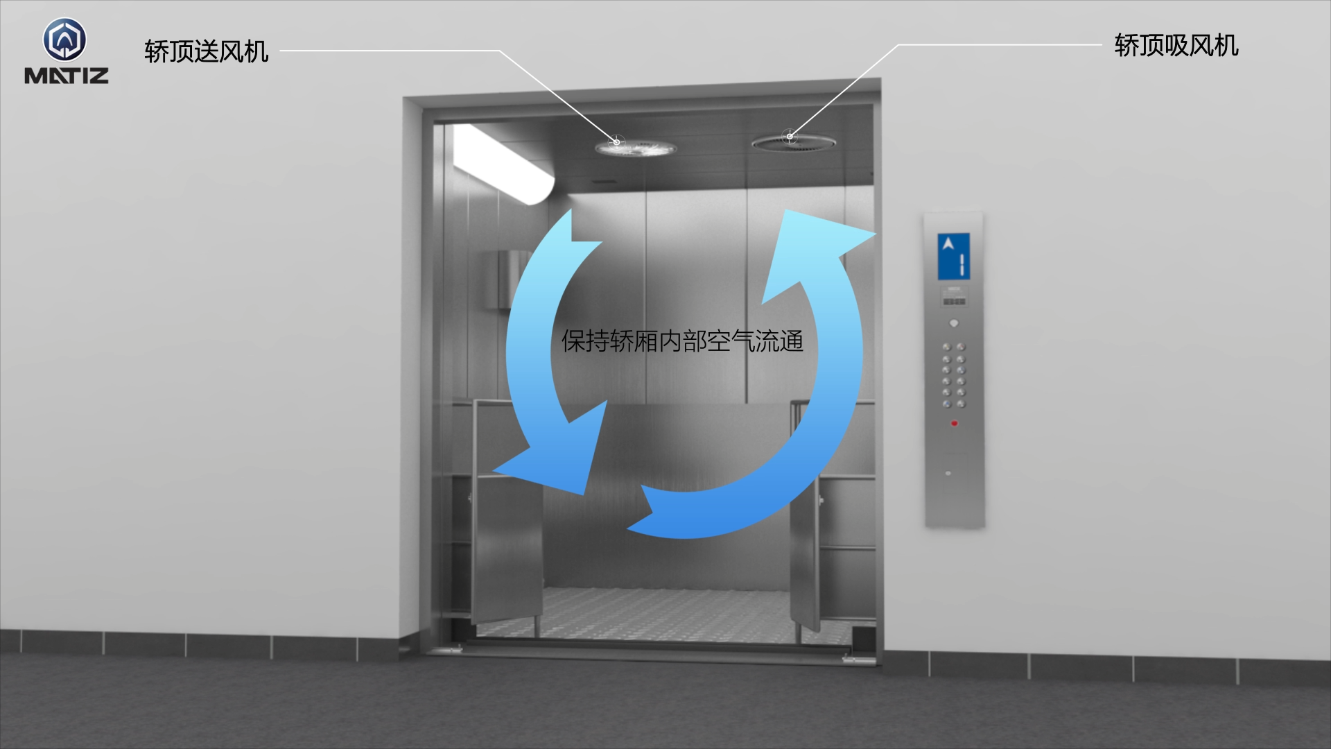 轿厢内配值2个强势开窗通风散热风扇,一吹一吸,及暧风空调机,保持轿厢内空气的分销;