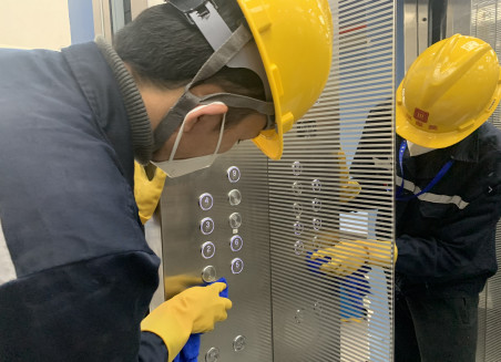 图为无机房客梯设备维护员参与无机房客梯酒精消毒上班